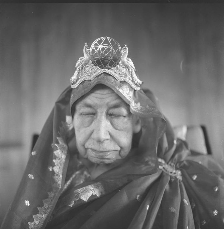 At the end of the summer of 1987 Roshan left the Ashram to resume her teaching duties in Bombay. When she came back in April 1988, we took up work with Champaklal again. I went to his room on the 28th with a framed photograph he had given me the year before, a little-known photo of the Mother taken on her birthday in 1973. She is wearing a dark red sari embroidered in gold and on her head is a large gold triangular crown with her symbol on it. Her eyes are closed and she is indrawn. When I first saw the photo, I was deeply attracted to it, so he gave it to me! But over the months I had not looked at it much. “I want to return this photo to you,” I said. “I have not been feeling much for it lately.” Happy to see the photo again, he looked intently at it for about two minutes. As he gazed, his face took on an uncanny resemblance to the face of the Mother in the photo; the extent of his identification was remarkable.
