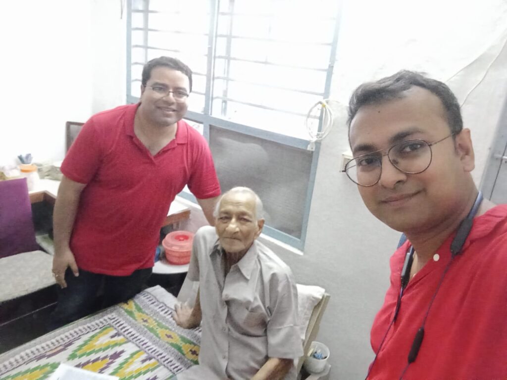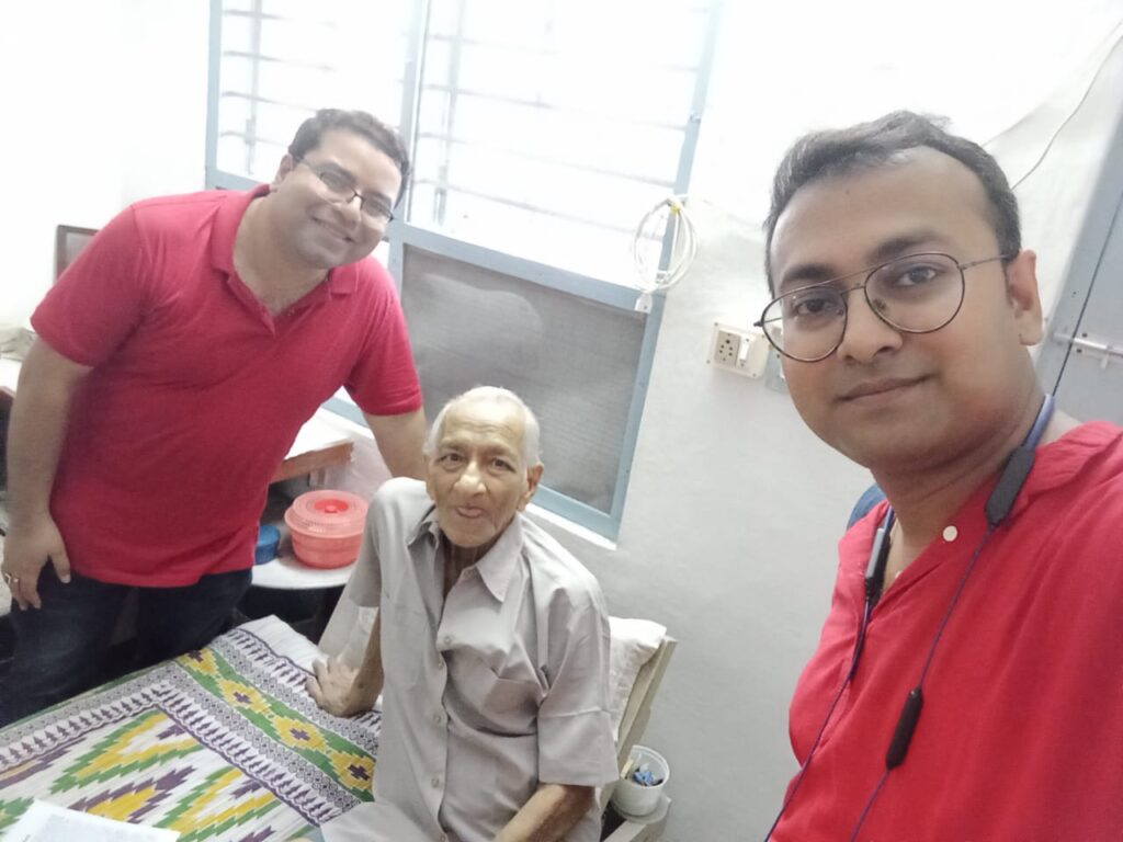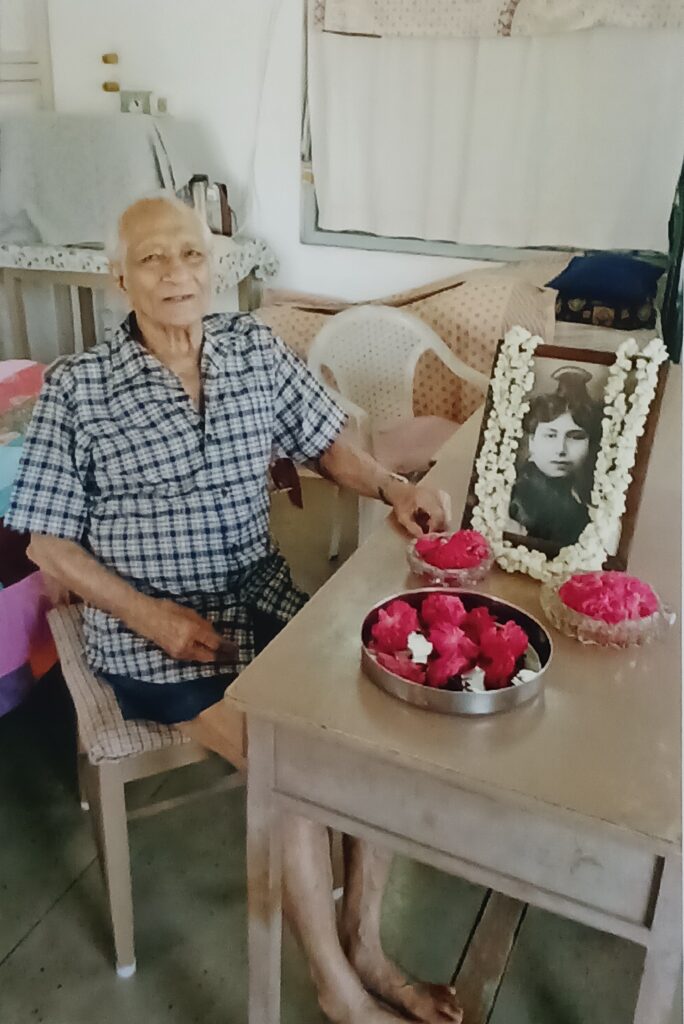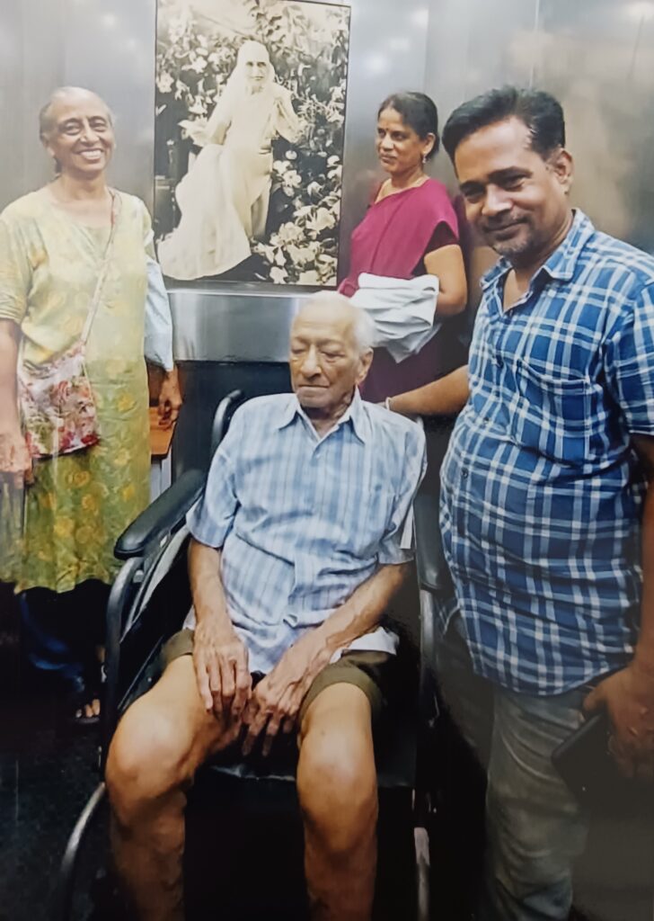 In July 2023 Aniruddha’s health deteriorated further. Nebulizers became his constant companion. Yet he continued to take his classes. Following the insistence of his well-wishers, he stopped his classes, thus ending his career as a teacher after sixty-eight years of faithful service. On 29 July he suffered another heart attack and was taken to the Ashram Nursing Home for treatment and recuperation. On 10 August he was discharged from the Nursing Home and brought back home. But there was no improvement in his health. His kidneys began to fail; internal haemorrhages began to take place; his oxygen level too was steadily falling. His face and feet had swelled up yet he remained calm, absolutely unperturbed. On 21 September he suffered his third heart attack and was persuaded to go to the Ashram Nursing Home. Reluctantly he agreed for he was not at all keen to leave his home—maybe he knew that he would not come back. He was immediately put on oxygen which continued to be administered till the end. There was a minor improvement in his condition in the first week of October but it was temporary. Meanwhile on 29 September his younger brother Amarnath passed away.
